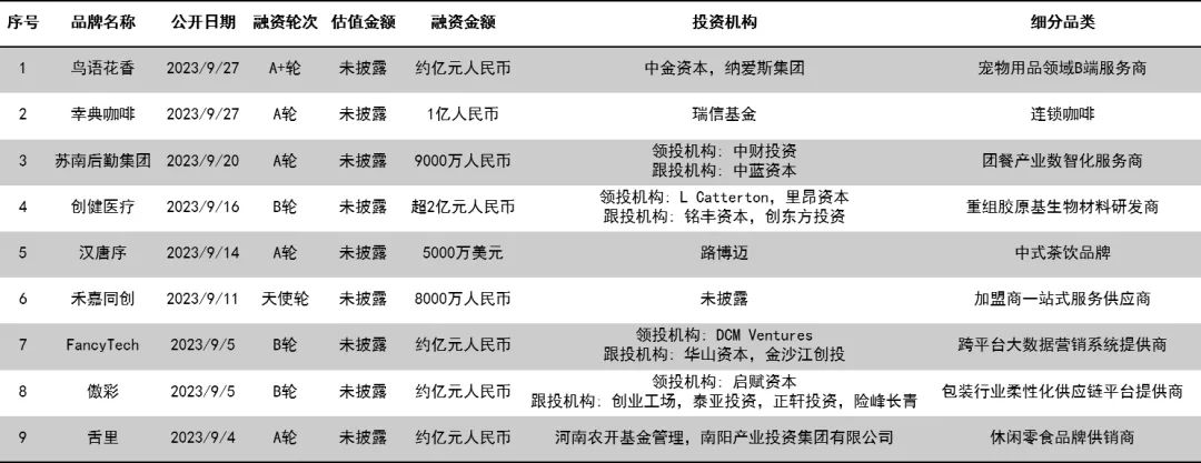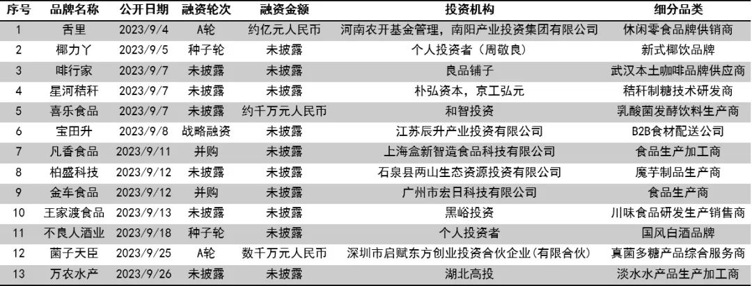 表 7 :2023年 9 月获得投融资的食品饮料项目