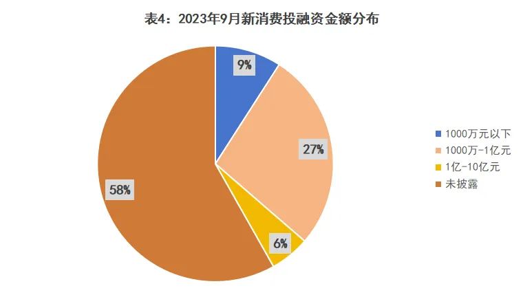 融资金额上,据蓝鲨消费估算,不考虑公开上市,9月份新消费领域公开融资金额的33起融资事件中,融资金额约13.90亿元,相比8月的14.24亿元有所降低。公开的融资金额以千万级为主,占比达27%,百万级别的投融资数量占比9%。