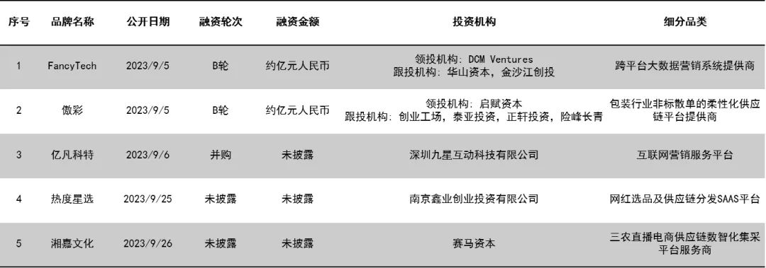 9月,消费赛道有5家服务商获得融资。其中,有2笔亿元级别融资,有4家与直播电商相关,分别为“Fancy Tech”、“亿凡科特”、“热度星选”和“湘嘉文化”。