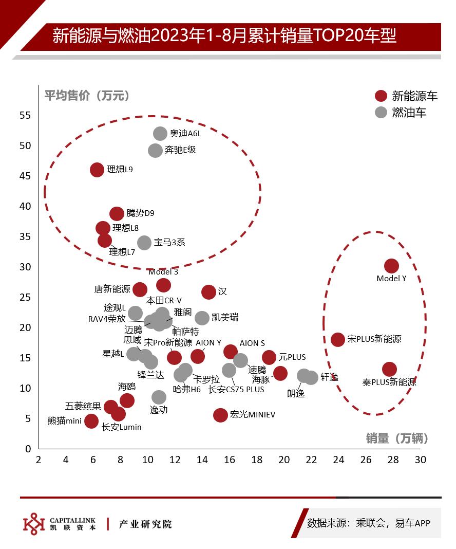 新能源车和燃油车各自累计销量TOP20的40款车型中,Model Y、秦PLUS和宋PLUS三款新能源车销量仍然保持着绝对领先的地位。此外,博越L和帝豪跌出燃油TOP20车型。