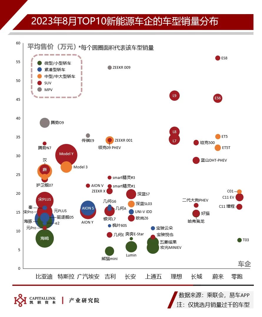 从单月销量前10新能源厂商的车型分布来看,比亚迪、吉利、长安的车型种类较多,理想、长城的车型种类较为单一;比亚迪、特斯拉、广汽埃安、上通五等车企均打造了显著的高销量车型。