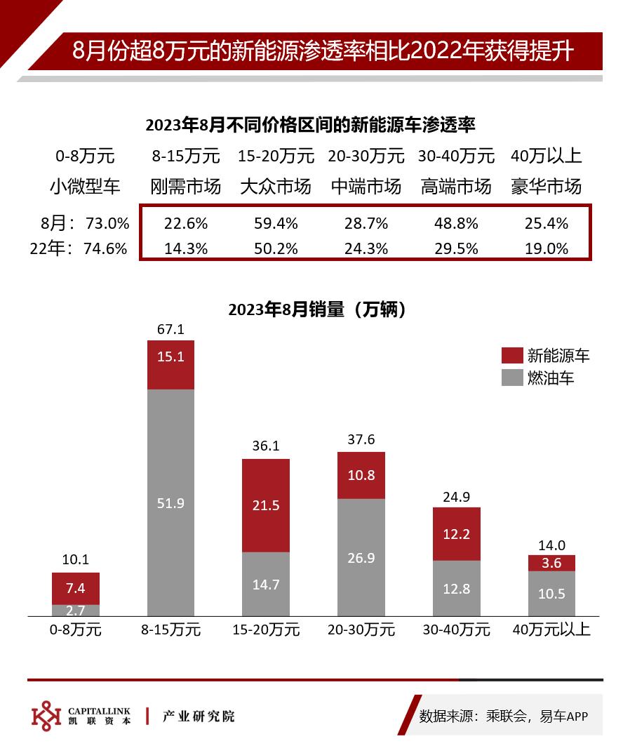 在8万元以下的小微型车市场,8月份新能源渗透率相比于2022全年水平有所下降;在超过8万元的各价格段中,新能源渗透率较2022年均有显著提升。在30-40万元的高端市场上,新能源渗透率实现了高速增长;在8-15万元刚需市场和40万以上的豪华市场有较大的提升空间。