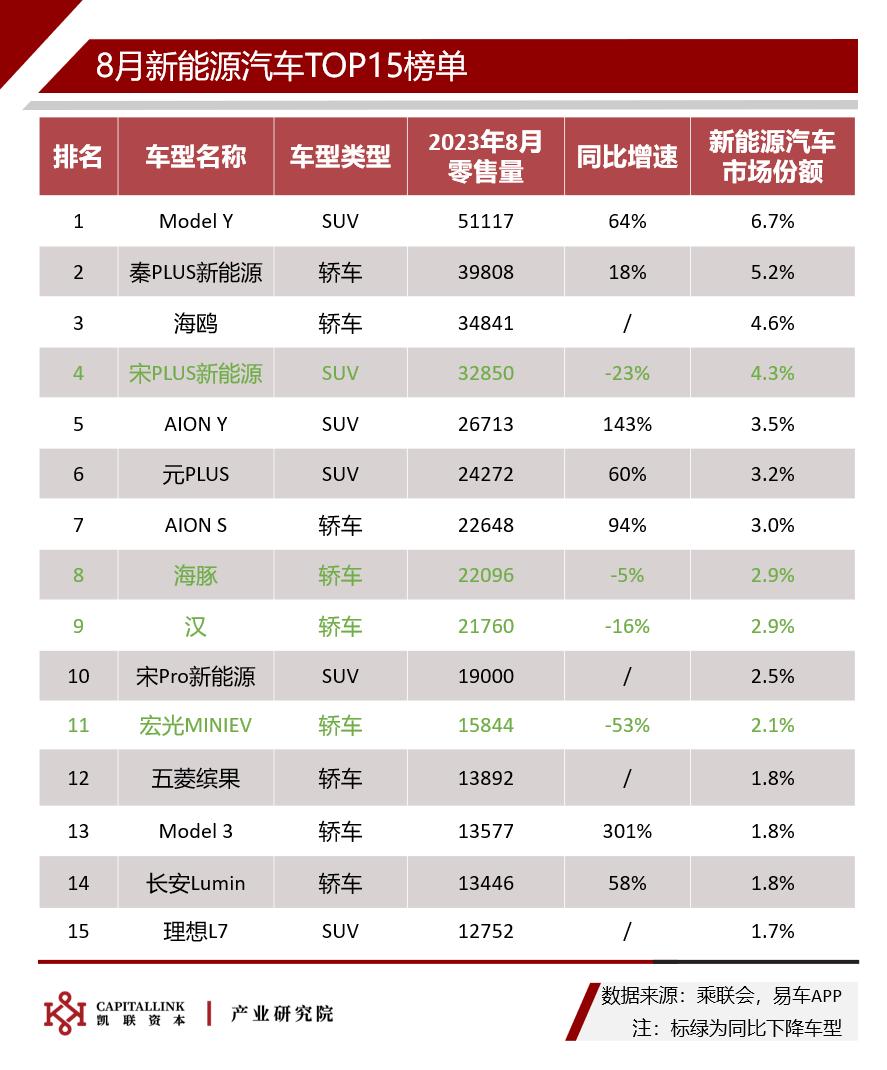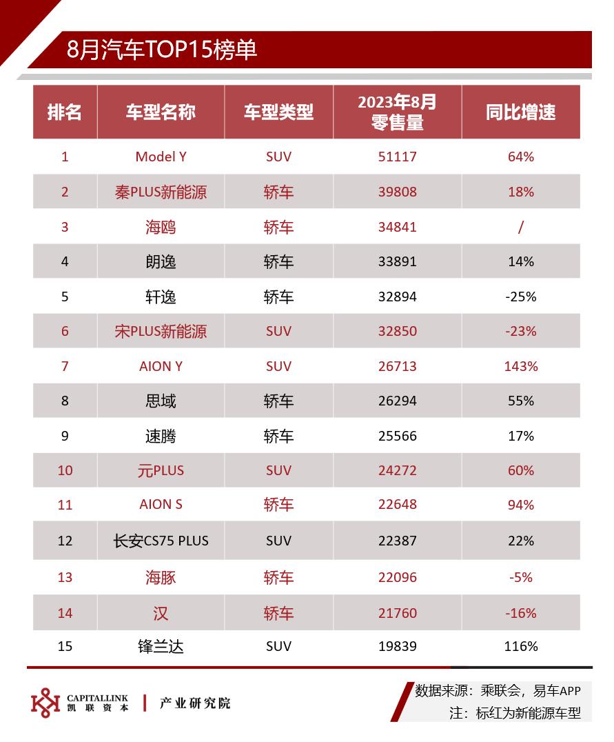 8月共9款新能源车型进入到汽车TOP15榜单。Model Y、秦PLUS和海鸥三款新能源汽车包揽前三。