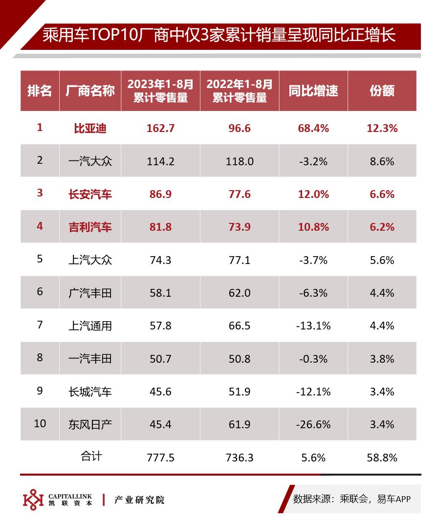 TOP10厂商的1-8月份累计销量合计同比增长5.6%。榜单中仅有3家厂商的累计销量实现同比正增长,其中比亚迪以其12.3%的市场份额和68.4%的同比增速,明显领先于其余厂商。