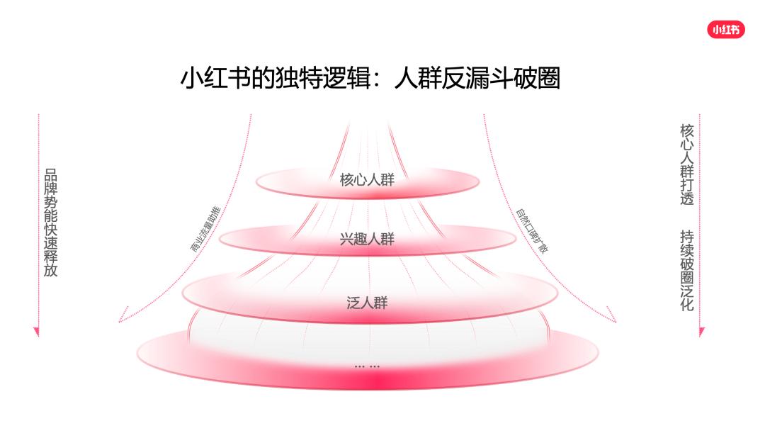 顾家家居案例中所提到的“人群反漏斗模型”,正是小红书“产品种草”的底层逻辑。不同于传统的先覆盖、再精准的“筛选”逻辑,大曝光后再层层下钻;而是“生长”逻辑,即先找到产品的核心人群,针对产品核心用户的痛点,沟通产品的核心价值,用产品对应的卖点或使用场景,打透这个人群,再通过核心用户的“口碑”效应,叠加商业流量,实现人群的层层破圈。