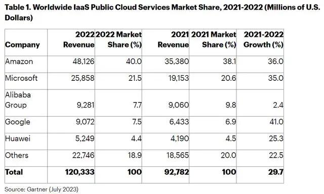 据Gartner公布的2022年全球IaaS市场份额,全球IaaS市场同比增长29.7%。但从市场份额来看,国内的阿里云和华为云都有所下降。