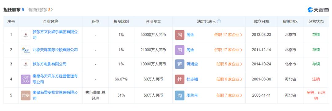 周先带则为北京天洋国际控股有限公司股东,同时是旗下梦东方文化娱乐集团有限公司、梦东方电影有限公司股东。