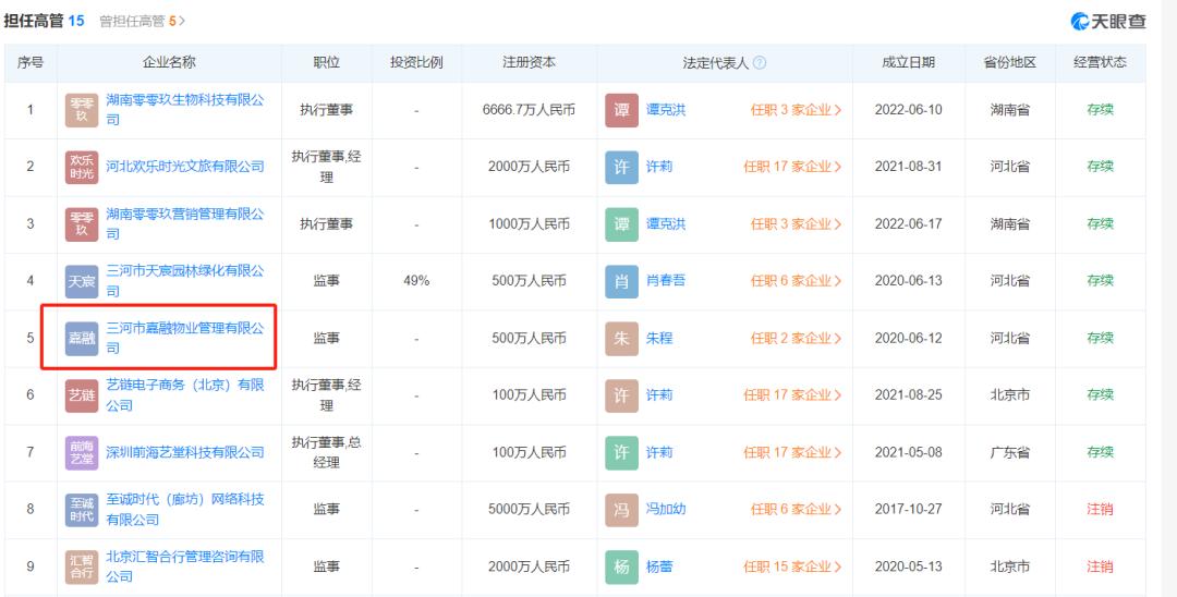 天眼查显示,许莉目前任4家企业法人,分别为河北欢乐时光文旅有限公司、艺链电子商务(北京)有限公司、深圳前海艺堂科技有限公司、天融物业服务有限公司三河市燕郊分公司。