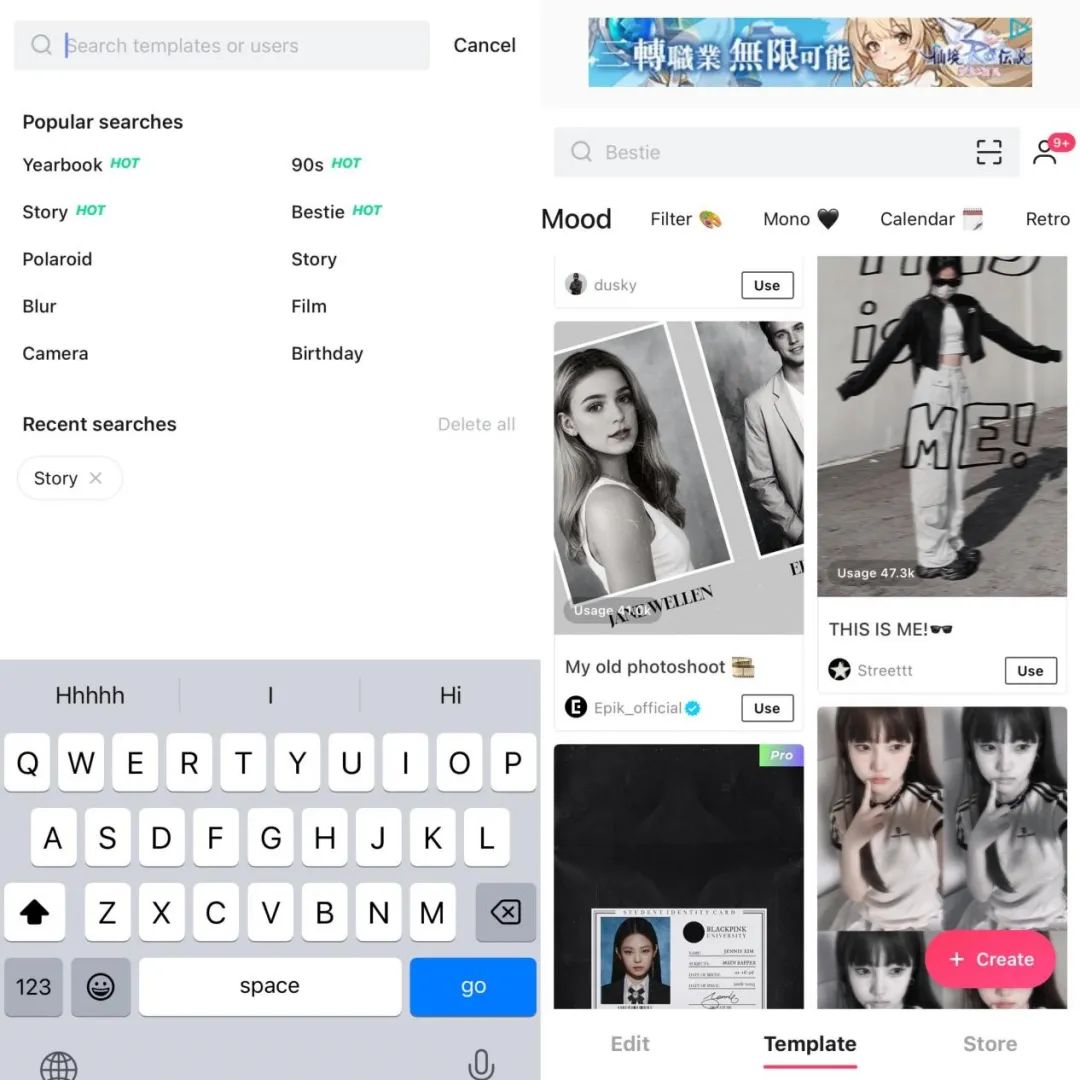 而为了照顾目的性更明确的用户,EPIK 在模板菜单的顶部也设置了搜索和子菜单,用户其实可以根据需求快速找到模板,比如是制作 ins story、拍立得还是手机壁纸,是希望将模板用于生日场景还是约会场景,是希望做出秋季的氛围还是复古的氛围等等。