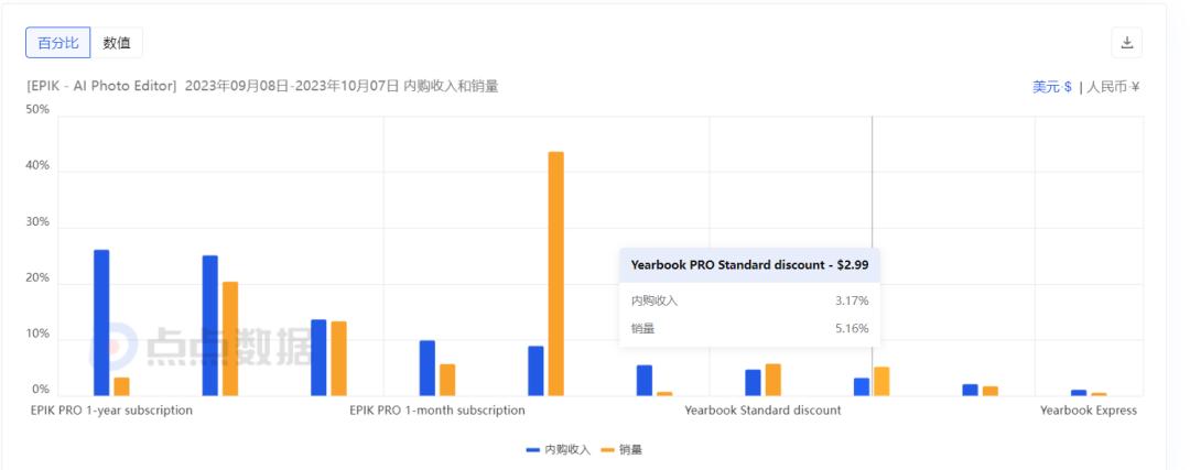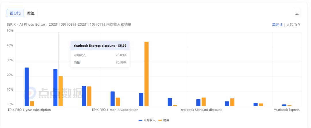 根据点点数据显示的 EPIK 美区应用内购买情况,在所有付费订单中,通过订阅而享受年鉴功能购买折扣的订单数超过了5%,这种“捆绑”销售还是帮 EPIK 转化了一些更具价值的订阅用户的。此外,9 月 23 日之后,销量最高的依然是 AI 年鉴功能,占比 26.17%。