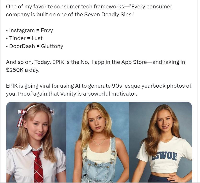 一位在 X(前 Twitter)上活跃的早期投资人发帖评价 EPIK 校园年鉴的爆火现象,观点十分有趣。他认为,所有成功的 toC 产品都建立在了人类的“七宗罪”上(这里不特指宗教上的七宗罪,而是泛指可能致人“堕落”的一些表现),例如,Instagram 抓住了人的嫉妒心,Tinder 抓住了人的欲望,DoorDash 抓住了人的贪吃心理。