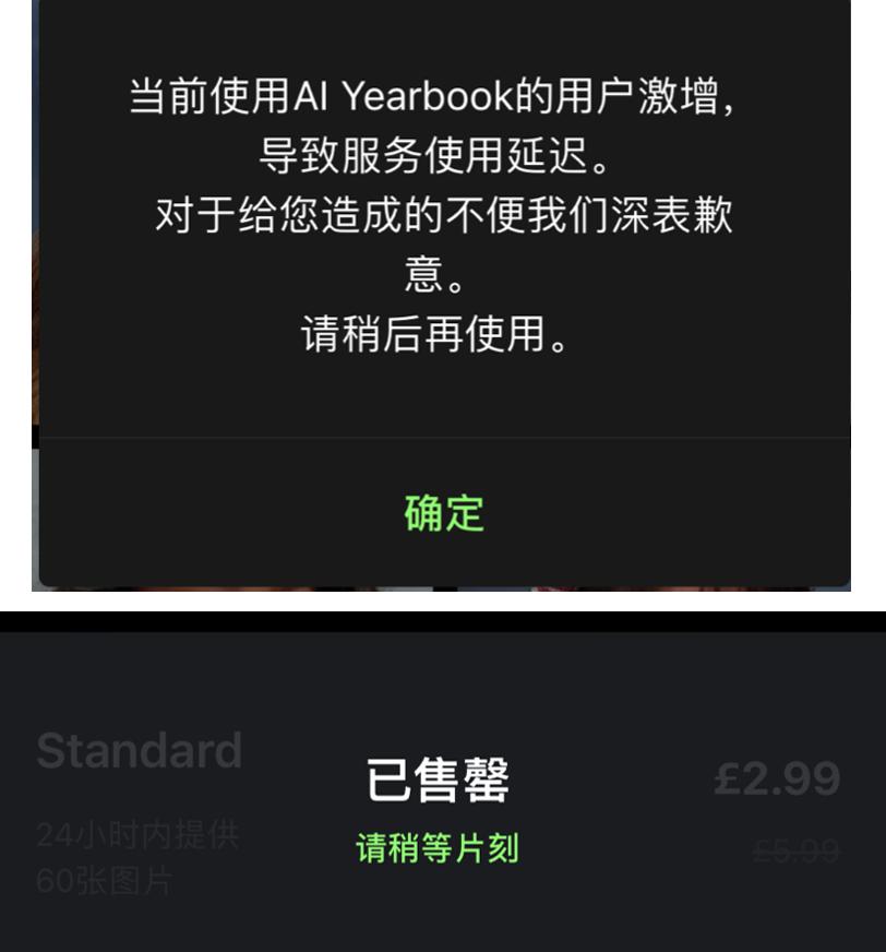 在笔者测试校园年鉴照功能时,总会弹出 AI Yearbook 需要等位、普快购买售罄的弹窗,这固然和用户太多导致服务器被挤爆有关系,但也不排除开发者饥饿营销的可能。