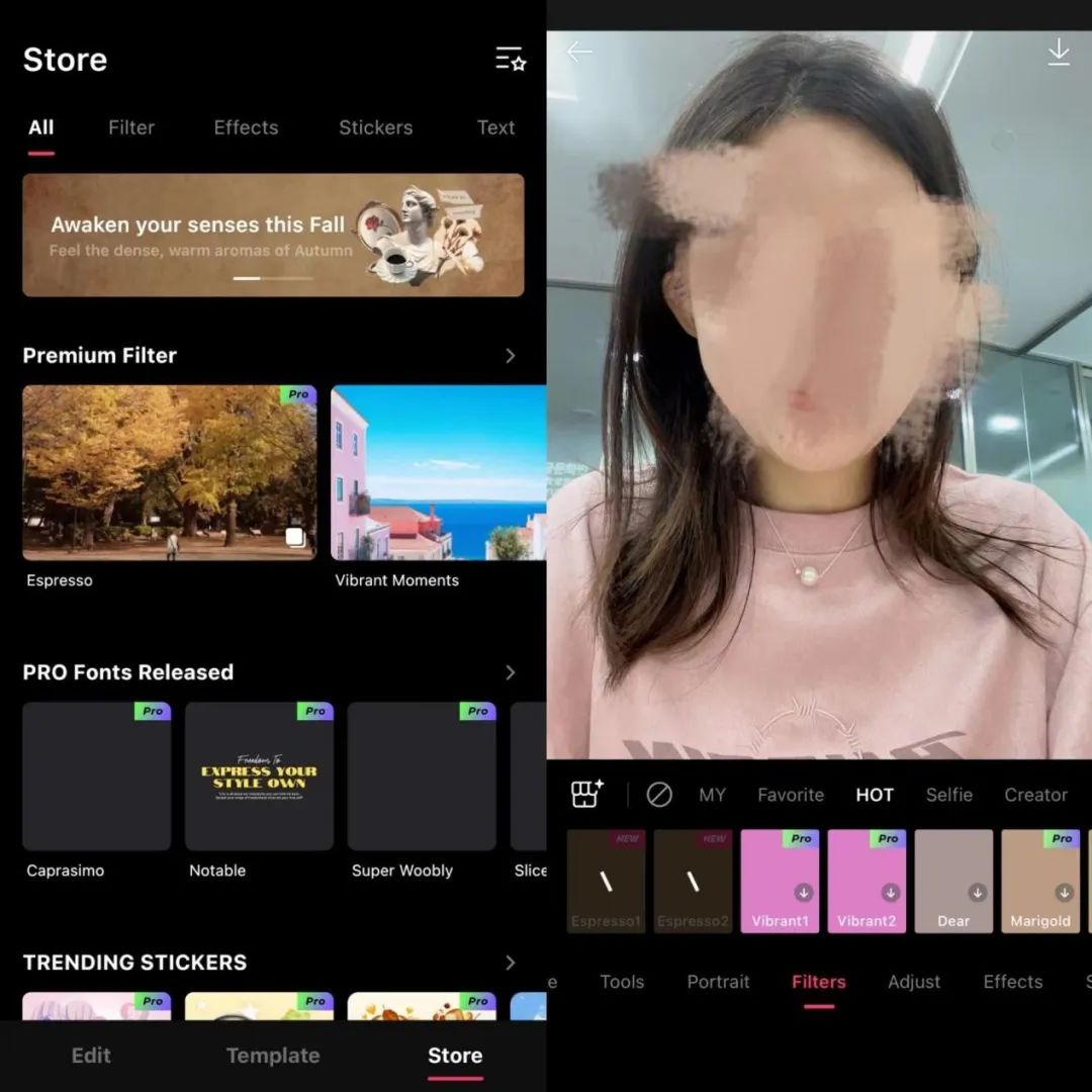 如果说首页和模板菜单的设计都藏了 App 运营者的小心思,希望能增加用户在 App 内的活跃,Store 版块的设计则更加工整和安全。EPIK 将模板做了更常规的分类,分为滤镜、特效、贴纸和字体,用户可以快速找到所需。虽然 Store 界面展示的全是付费模板,但点击进去,其实就是修图界面,用户可以选择任何免费或付费模板。