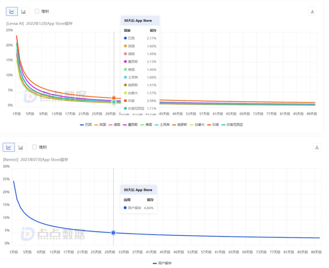 Lensa 2022 年 12 月 30日用户留存(上)VS Remini 2023 年 7 月 30 日用户留存(下)|来源:点点数据
