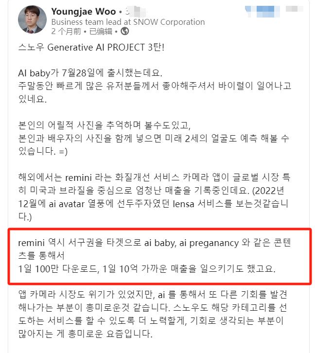 Snow Corporation 之所以能找到校园年鉴的切入点,笔者在这里做一个有些过度解读的推测。根据商业化团队负责人 Youngjae Woo 的社媒帖文,Snow Corporation 一直在关注各图片 App 的功能变化。早在 7 月份 Remini 靠 AI 回到儿童时代功能又一次增长时,团队就注意到这一点。加上 2023 年以来“复古怀旧风”在服装、图片及社交 App 等赛道都带火了不少品牌/产品,开发团队想到做一个结合也在情理之中。