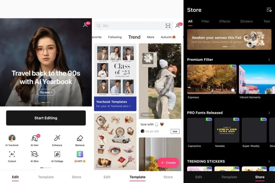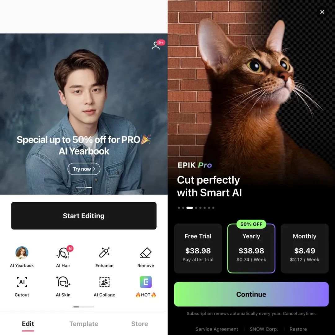 与 EPIK 的 icon 配合,整个 App 以黑白为主色调,分为 3 个主菜单,修图(edit)、模板(template)和商店(store)。首页为修图菜单,超过屏幕一半的界面都在滚动播放 EPIK 的热门功能,90 年代校园年鉴、AI 发型以及订阅制限时折扣的公告,下方才是 EPIK 的其他功能,能让用户一眼 get 重点。