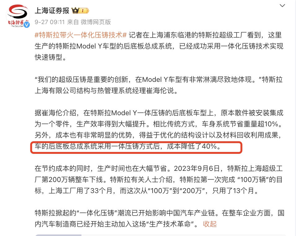 此事最早由上海证券报报道,引用了对特斯拉的工作人员采访,我查了下人家原文是这么说的:“据特斯拉上海有限公司结构与热管理系统经理崔海伦介绍,该技术使成本也有非常明显的优势,车的后底板总成系统采用一体压铸方式后,成本降低了40%。”