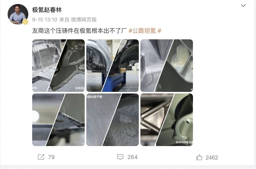 而极氪汽车副总裁赵春林则直接在社交媒体上指出,“友商这个压铸件在极氪根本出不了厂”。