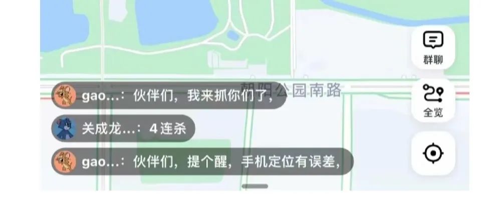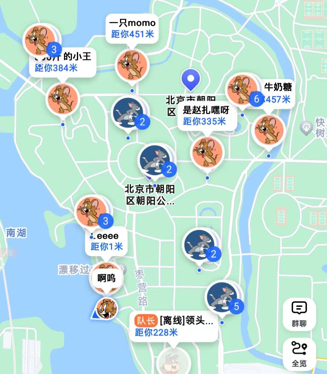 这些是抽到老鼠一方的玩家,鼠鼠是他们的代称,可爱版。按照规则,鼠鼠们在游戏最开始有三分钟的逃跑与躲藏时间,三分钟后,他们需要打开地图上的“位置共享”,抽到猫的一方将全部出动,依据地图线索在朝阳公园的各个角落里寻找老鼠玩家。
