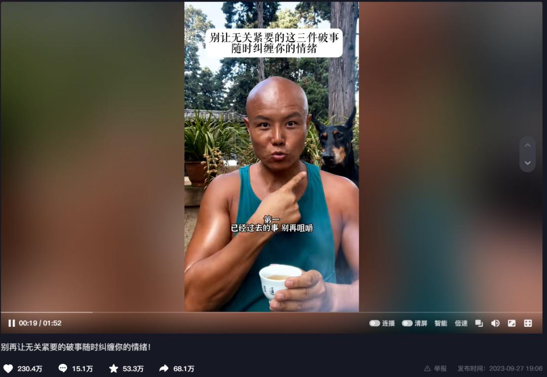 尤其是9月27日,“乐嘉”发布了一条主题为《别再让无关紧要的破事随时纠缠你的情绪》的视频,获赞230万。视频中,乐嘉皮肤黝黑,端坐着,手中握着一杯茶,身后跟着一只黑色的小狗,缓缓说着“心者有所累,无心者无所谓”。