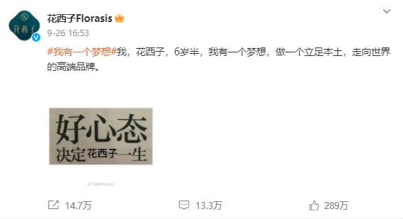 认同,不但人有,品牌也有,其威力是十分巨大的。大家还记得被外界誉为“发疯”的花西子相关声明吗?9月26日,花西子的官方微博发布了一则微博,“好心态,决定花西子一生”的图片,搭配“我,花西子,6岁半,我有一个梦想,做一个立足本土,走向世界的高端品牌”,的文案。
