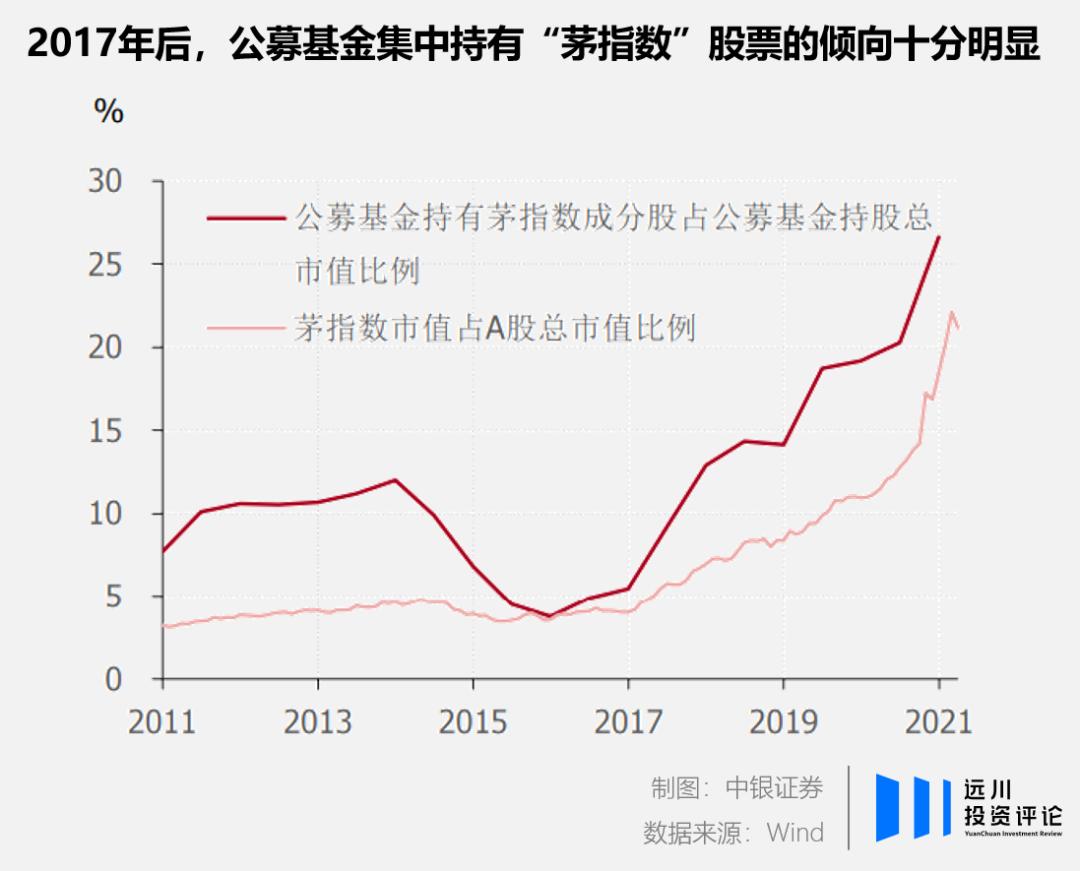 所以,以2017年前后为起点,公募基金增持核心资产的倾向非常明显,并一步步演化为了“基金抱团”,“茅指数”成分股占公募基金持仓的比重由 2016 年底的 5.4%上升至 2020 年末的 26.6%[4]。