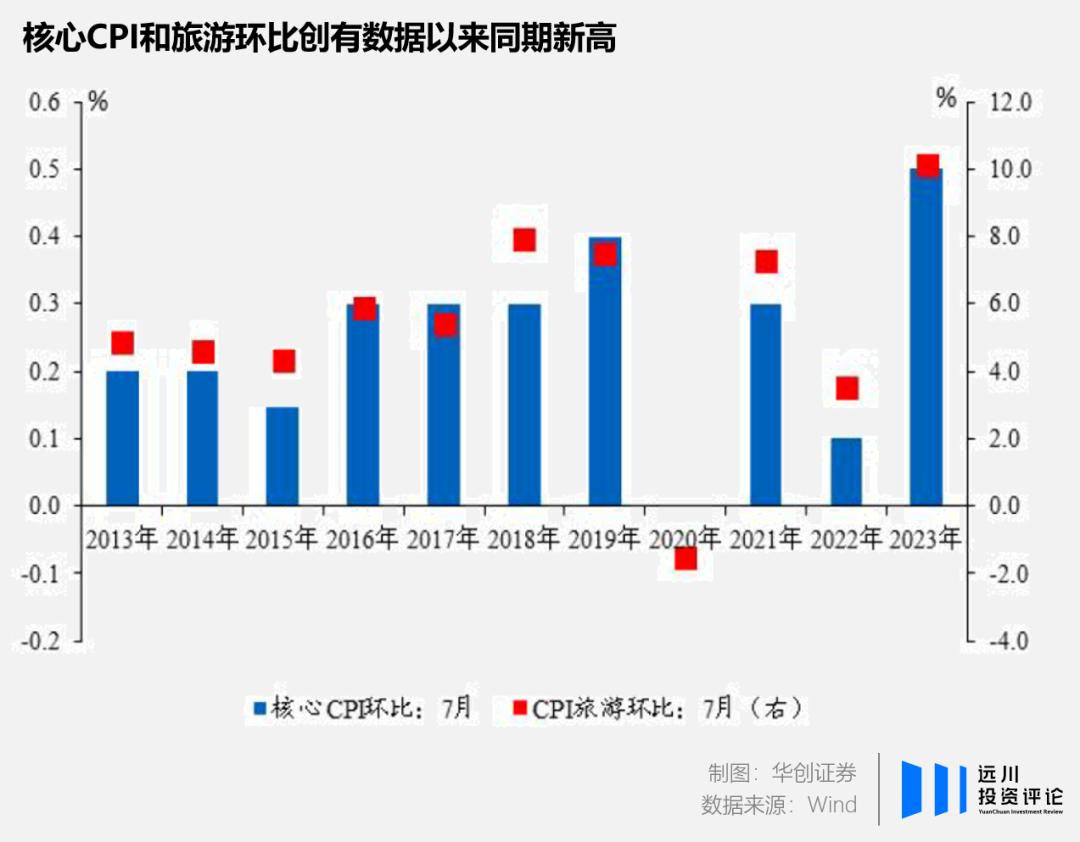 根据华创证券周冠南团队分析,去年7月份猪肉价格涨幅很大,所以CPI基数较高,而今年CPI之所以持续下行,也主要是受以猪肉为代表的食品价格拖累。剔除供给和高基数的扰动后,7月份的核心CPI在旅游出行需求释放的带动下环比大幅上行,创有数据以来的同期新高,释放出消费需求修复的信号。