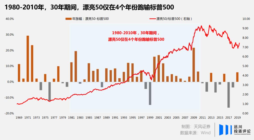 所以,半夏投资的几篇文章下面,冷嘲热讽随处可见,但李蓓看多的逻辑并非无的放矢,她的逻辑恰恰与20世纪70年代之后美股“漂亮50”持续跑赢标普500的逻辑吻合。