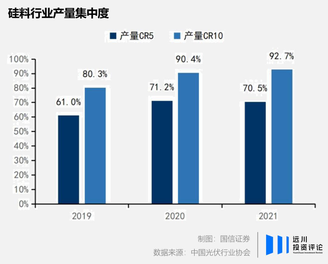 而当行业景气度上升需求高涨之时,头部企业的产销率先饱和,订单溢出,中小企业反而获得发展良机,比如在2021年光伏行业的高光时刻,产业链最上游的硅料供不应求,龙头企业如通威股份等赚的盆满钵满,但从竞争格局看行业CR5当年的市占率反而略有下滑。