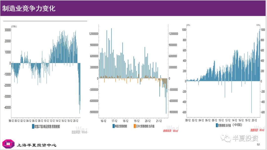 虽然在很多人眼里,2022年是“中国经济出现巨大困难,遭遇重大挫折的一年”,但从全球几大制造业优势区域的对外贸易情况来看,中国制造业的竞争优势反而在扩大,因为“无论欧洲还是日韩,都已经从贸易顺差转为贸易逆差,只有中国贸易顺差在持续扩大创新高”[7]。