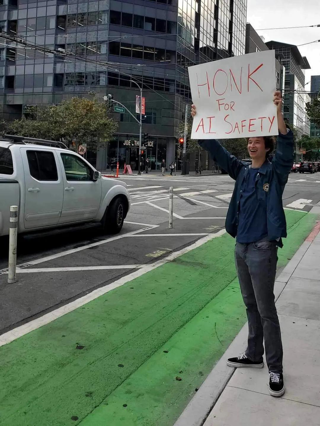 这些抗议者自称为「concerned citizens」(关心某事的公民),由 Holly Elmore 领导。根据领英信息,她是 AI Pause(中止 AI)运动的独立倡导者。