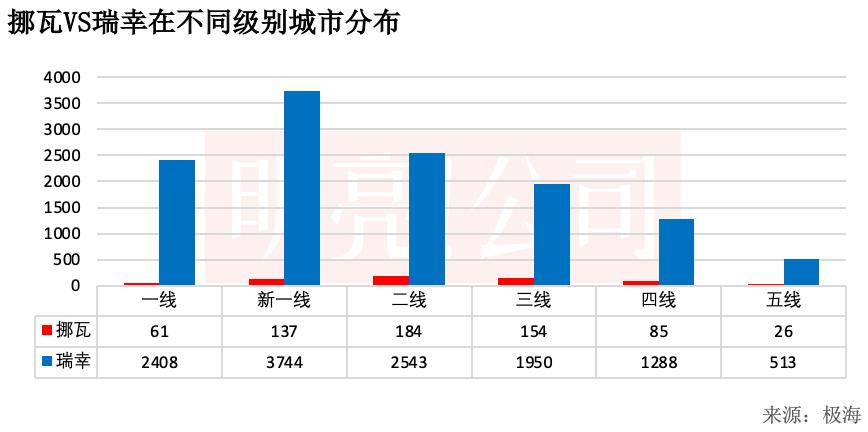 在对不同城市布局上,挪瓦咖啡更加偏向于新一线到三线城市。相比于瑞幸,挪瓦咖啡的品牌影响力较弱,避开一线城市的激烈竞争也许是明智选择。瑞幸从一线城市创立,门店最多的城市级别为新一线城市,高于一线城市数量多,新一线、二线和一线是瑞幸门店最多的前三个区域。
