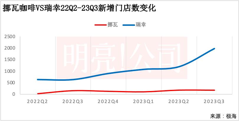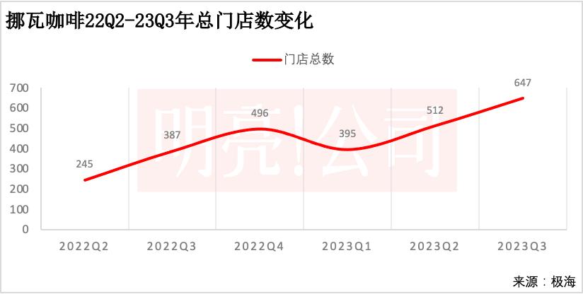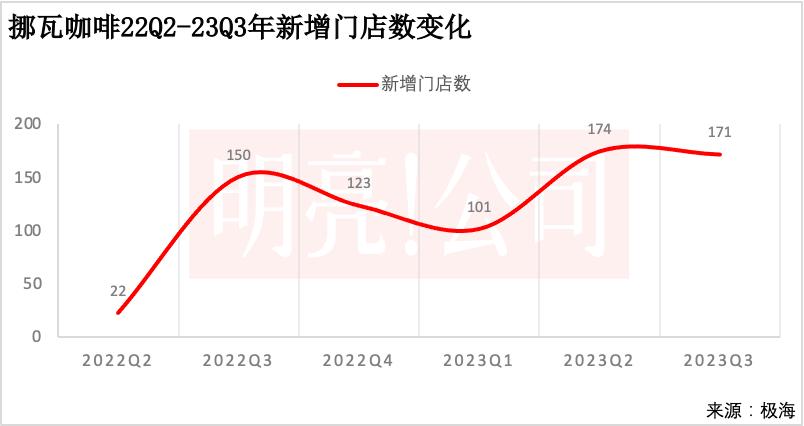 2020年10月挪瓦咖啡开出第一家门店,2022年二季度新增门店还相对缓慢,到2022年三季度季度新增门店达到150家,当年的四季度和2023年一季度新增门店变少但也保持在百来家,到2023年二季度,新增门店达到174家,三季度(截至9月底)也新增了171家门店。