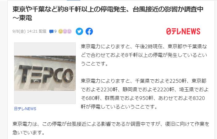 今年9月初的13号台风登陆日本,就造成了日本东京千叶等地区多达8000多户的停电。