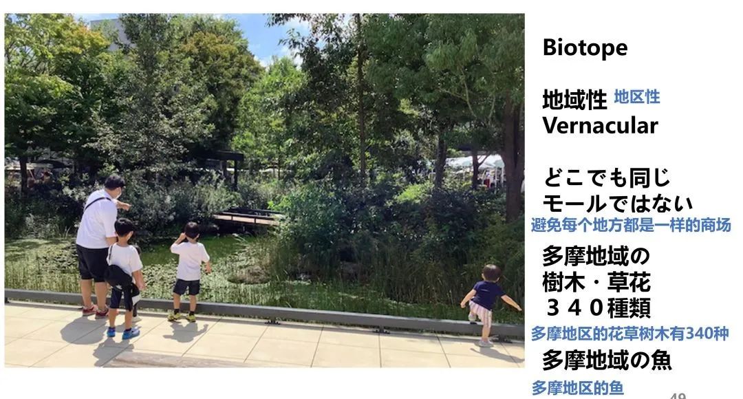 虽然是个商业体,但是这里面自然元素非常充分,有大量的生态圈在里面建造,而且是非常地域化的。所以它里面所有的一些植物都是本地的,常年以来生长的各种花草树木,大概340多种,把它汇集起来,做了一个独一无二的属于这个地区的生态圈,连水池里养的鱼都是当地的土著鱼。