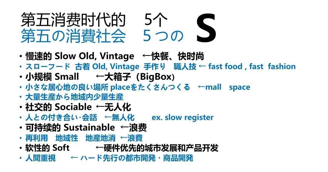 大家开始去思考,不是如何去卖出更多的商品,而是从物质的量到开始去思考如何去提供生活的质,从卖更多的商品到开始去思考如何为顾客提供更好的生活。更多的企业开始去思考,在第四和第五消费时代的时候,人如何汇集在一起?街道到底意味着什么?居住地又意味着什么?
