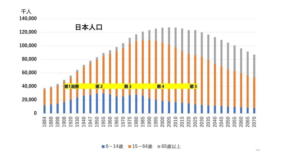 25年后的中国就是今天的日本。人口结构上,老龄化的程度或者人口衰退程度,中国比日本晚了25年。中国的出生率已经比日本还低了,20年、21年中国的出生率,已经连续两年低于日本。人口是消费最主要的动因,所以研究人口能看到很多规律。