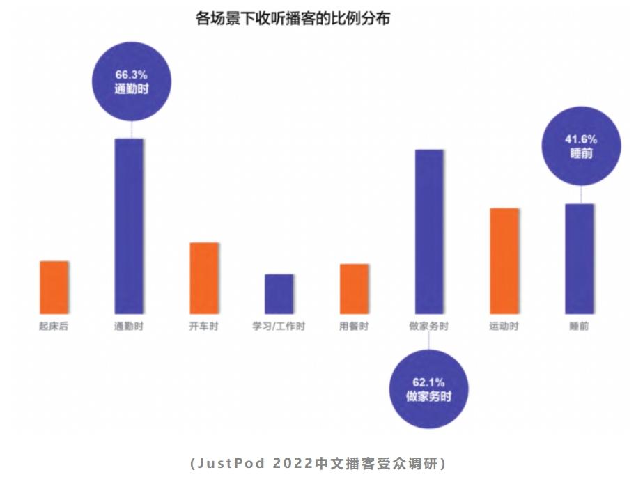 从收听播客的场景来看,排名前三的场景分别为通勤时、做家务时和睡前,这些时间段更碎片,不会对用户的工作、休息时间进行太多入侵,而是润物细无声地填补了这些碎片时间的注意力空缺。不过也有听众表示,自己会对不同时间段收听的播客内容进行选择,在放松时会选择更轻松愉快的主题,而在收听一些干货较多的播客内容时,会选择一个整段的时间,甚至还会做笔记和反复收听。