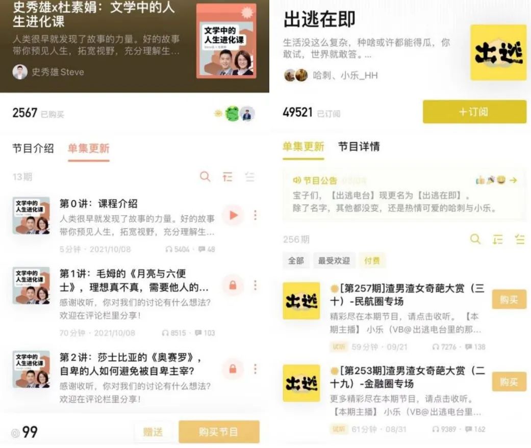 除了商业推广外,播客的另一种盈利模式则是付费节目。对于已有一定订阅量和知名度的播客来说,对一些含有大量“干货”的节目收费是不错的商业化路径。付费节目中,既有全系列付费,也有单集付费。以两档较头部的播客节目为例,播客「Steve说」的主播心理咨询师史秀雄Steve与华东政法大学教授杜素娟合作的《文学中的人生进化课》共8讲,售价99元,在小宇宙上卖出了2500+份,收入25万+。播客「出逃在即」则主要是分享“都市魔性生活”,在其系列节目“渣男渣女”广受听众好评之后开始对该系列单集进行收费,单集收费5元,每集一般有大几千小一万的播放量,单集收入三五万不等。此外,听众还可以对喜欢的节目进行打赏。付费和打赏对于优质的内容创作者来说,也可以带来比较可观的收益。