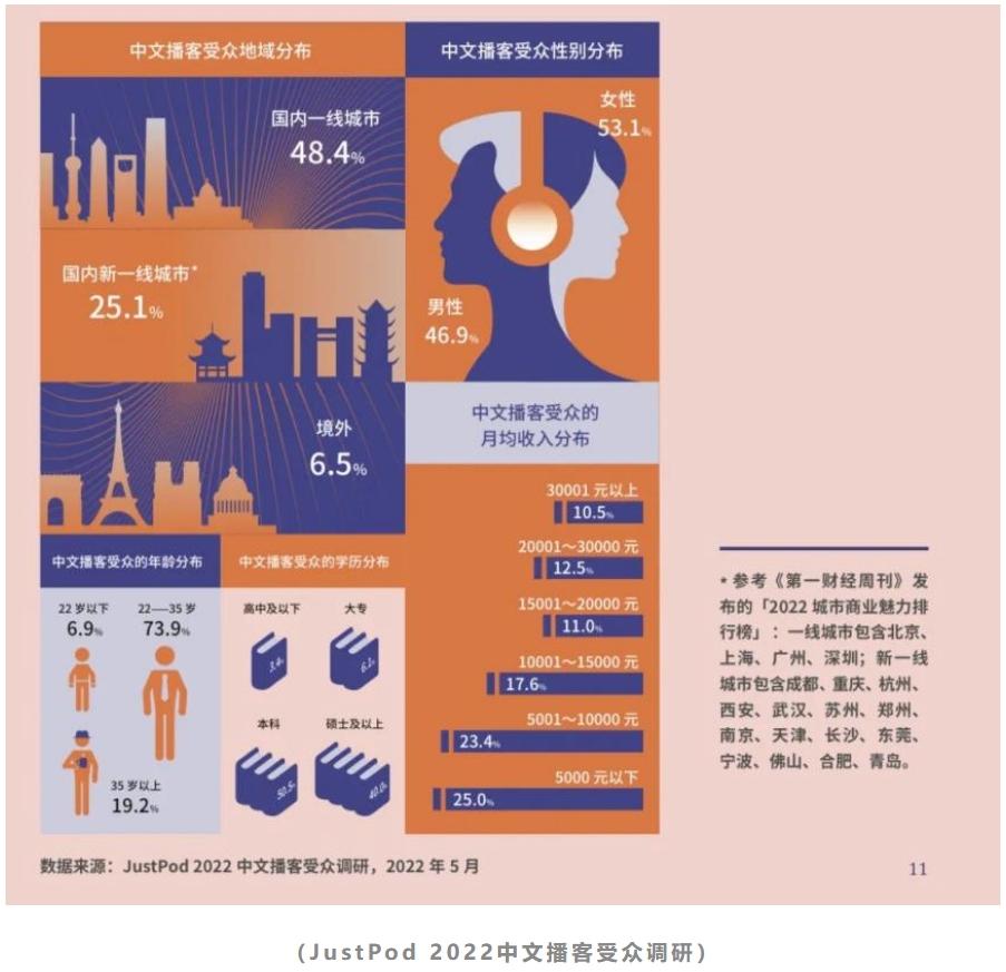 那么,到底谁在听中文播客呢?根据JustPod 2022中文播客受众调研,从地域来看,播客听众主要集中在北上广深和新一线城市;性别分布上女性略多于男性;年龄主要集中在22-35岁,以学生、白领、互联网从业者居多;学历分布中,超过80%的播客听众为大学本科以上;超过50%的播客听众月均收入超过1万元。总体来说,播客受众群体表现出非常明显的年轻、高知、较高收入的标签。