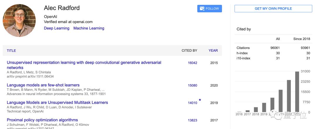 这个只搞大模型的本科生,就是Alec Radford,如今在谷歌学术上的论文引用次数已经达到9.6w+。