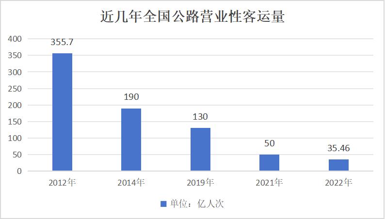 交通运输部数据显示,全国公路营业性客运量在2012年达到顶峰355.7亿人次,后续持续下降,目前只剩下35.46亿人次。
