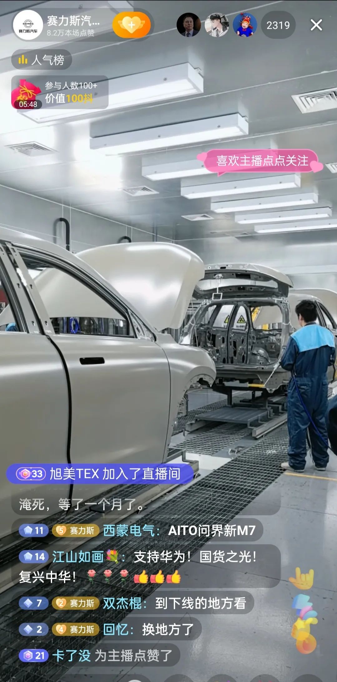 到了中午,“赛力斯汽车智慧工厂”在抖音开启直播,向广大网友展示问界新M7的生产进程。