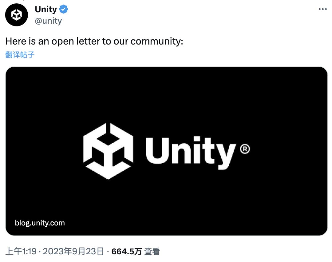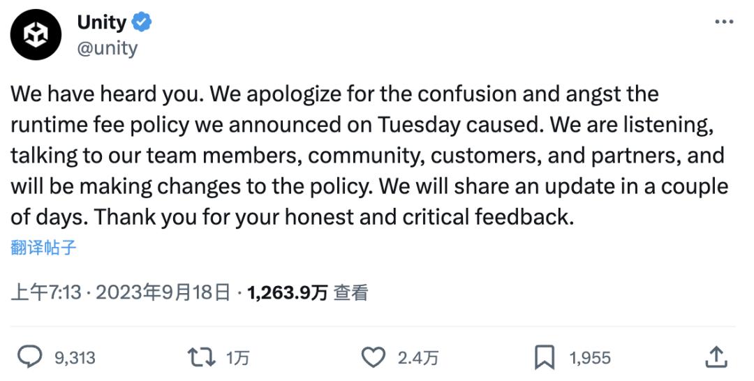 虽然此后 Unity 先是在 X(前身为 Twitter) 平台针对收费政策作出道歉: