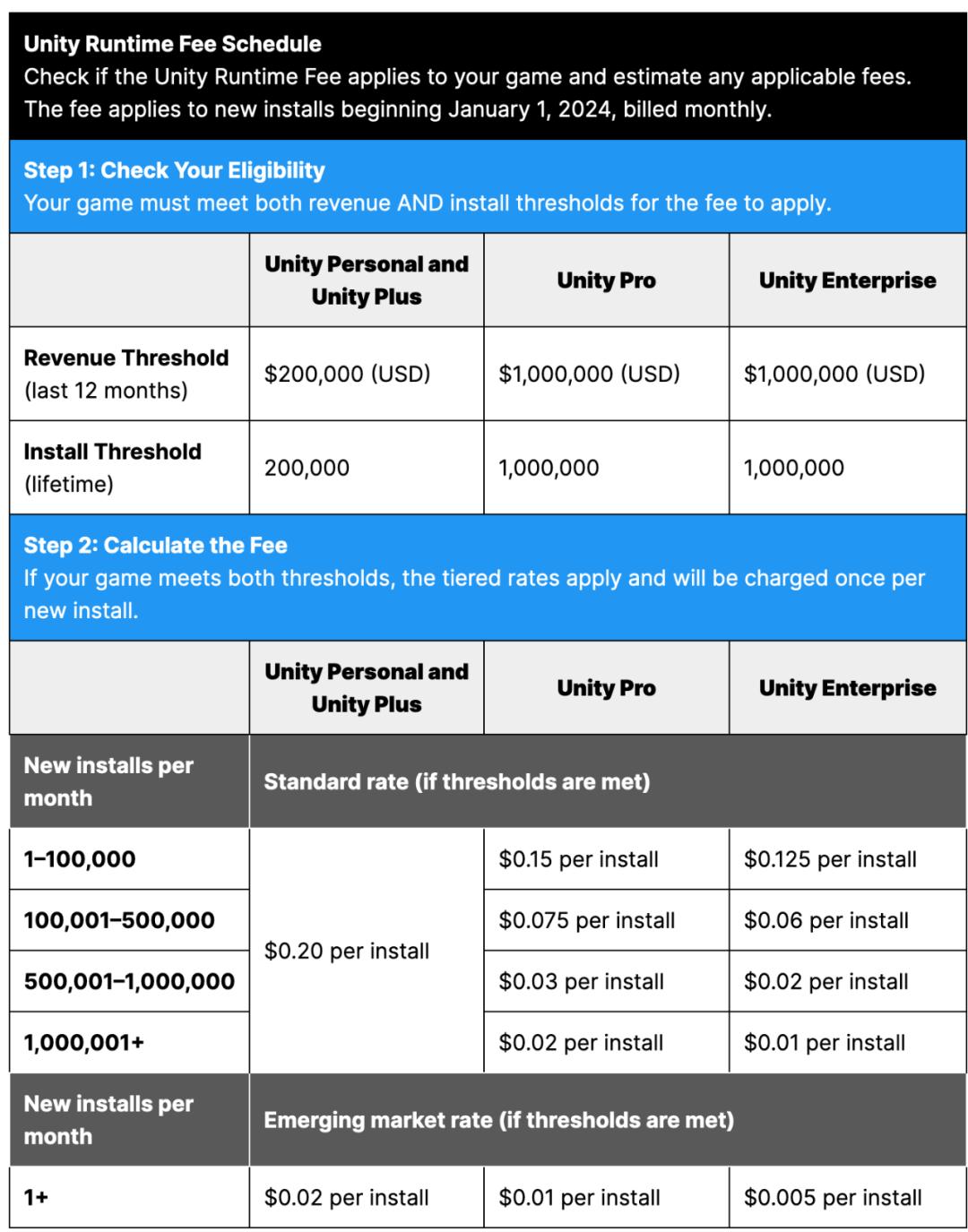 根据当时的政策,开发者在使用 Unity Runtime 费用按照安装量来算,最低为每次下载 0.005 美元,最高为 0.2 美元,无疑将其开发成本显著增加。