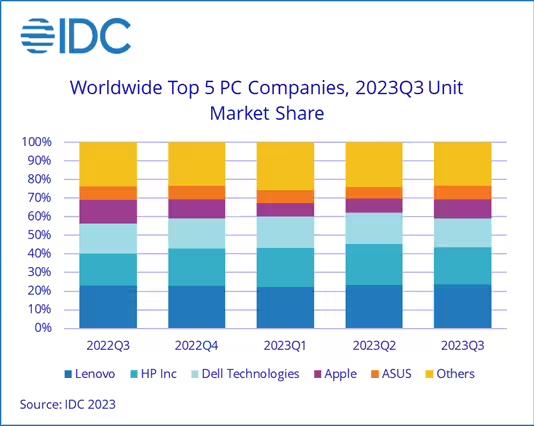 数据显示,联想以1600万台出货量问鼎2023年三季度,市占率达到23.5%,惠普的出货量则是达到1350万台,市占率19.8%,位列第二名,而戴尔出货量为1030万台,市占率15%,排行第三。