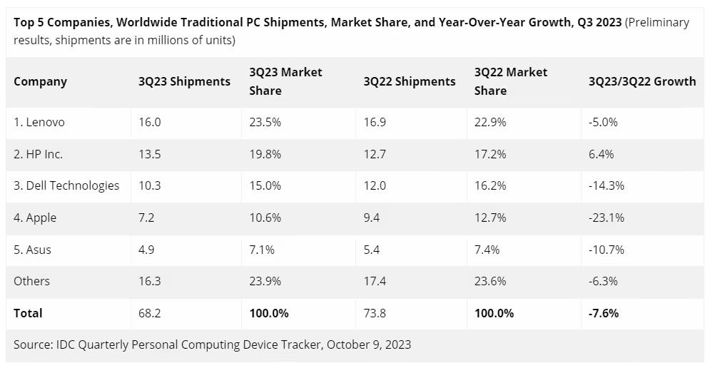 研究机构IDC在最新出炉的PC行业报告中提到,2023年第三季度全球个人电脑市场出货量同比下降7.6%,但环比增长达11%,总计出货量6820万台。IDC认为,在过去两个季度中,个人电脑出货量降幅较去年同期有所减缓,市场需求也在逐步回到正常水平。