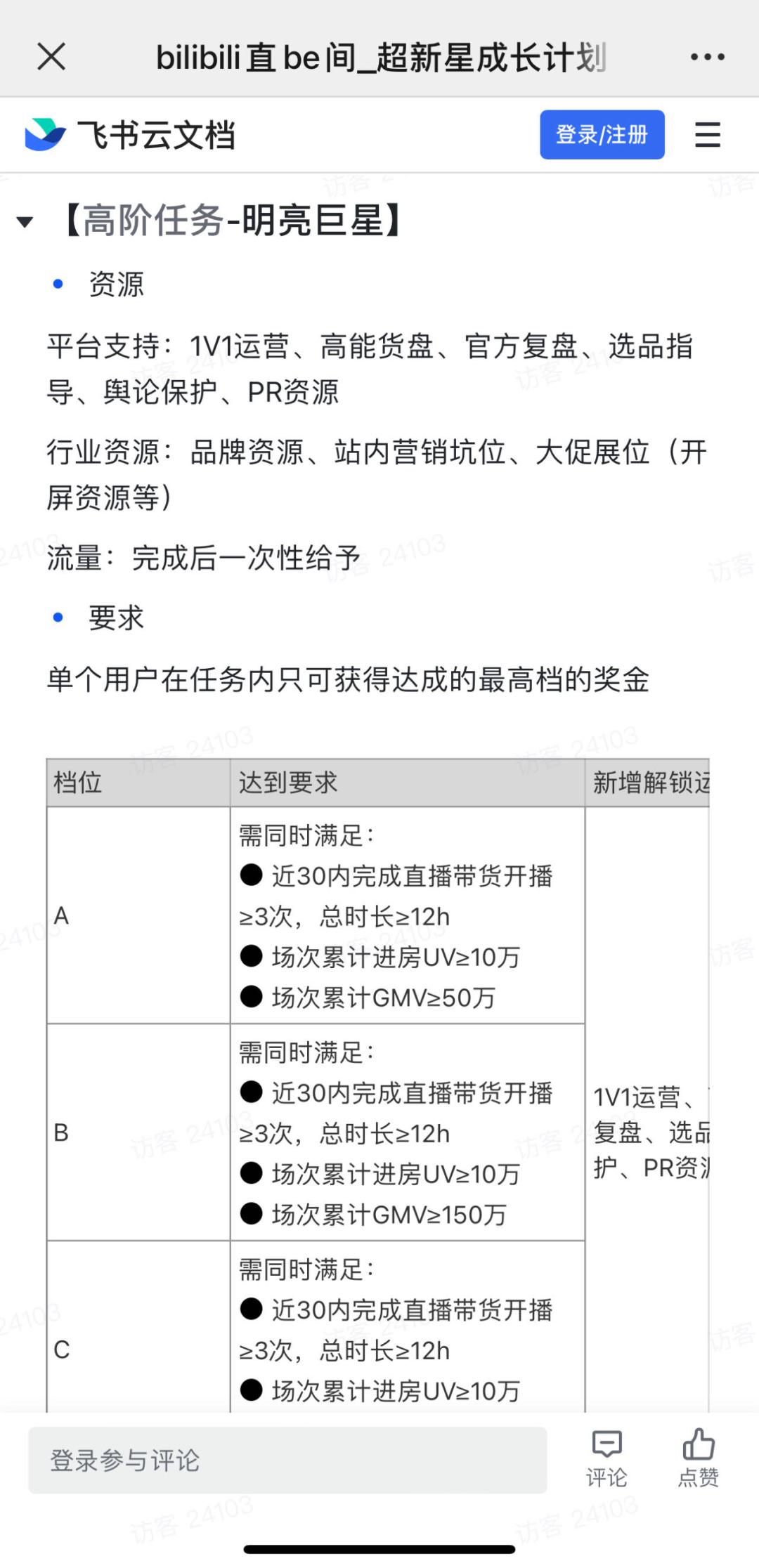 以高阶任务的A档成绩为例,UP主需同时满足近30日内直播带货开播次数≥3,开播总时长≥12h;场次累计进房UV≥10万;场次累计GMV≥50万,UP主能获得相应的运营指导、品牌资源以及1.2万元推广金 (流量权益,完成后一次性给予) 。