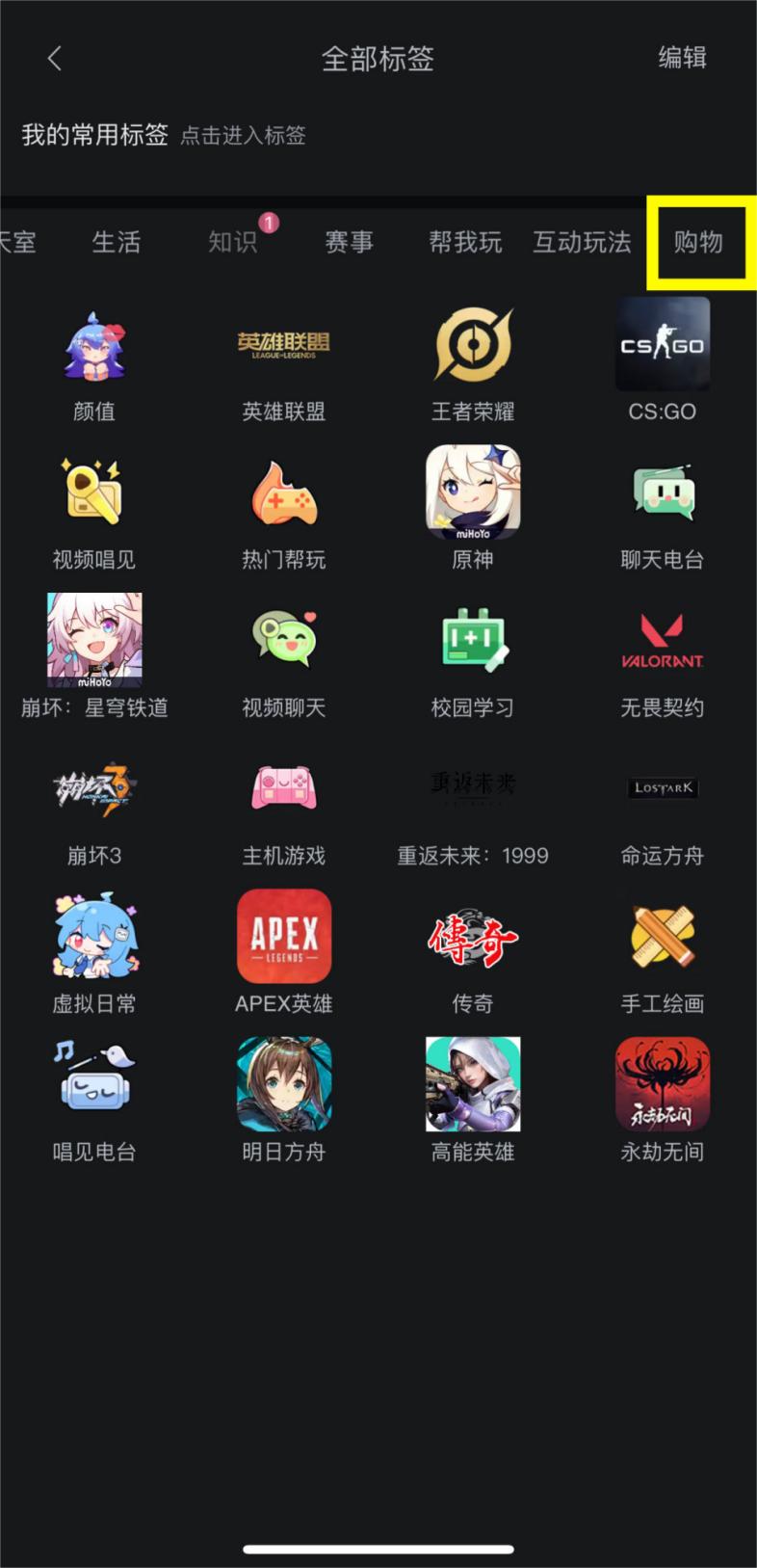 不同于首页的会员购入口,目前B站并未开放专门的直播带货入口,而是将入口设置在直播频道之下,“购物”都被折叠在栏目末端,排在购物前面的,是游戏、娱乐、虚拟主播、生活、知识、赛事等板块。