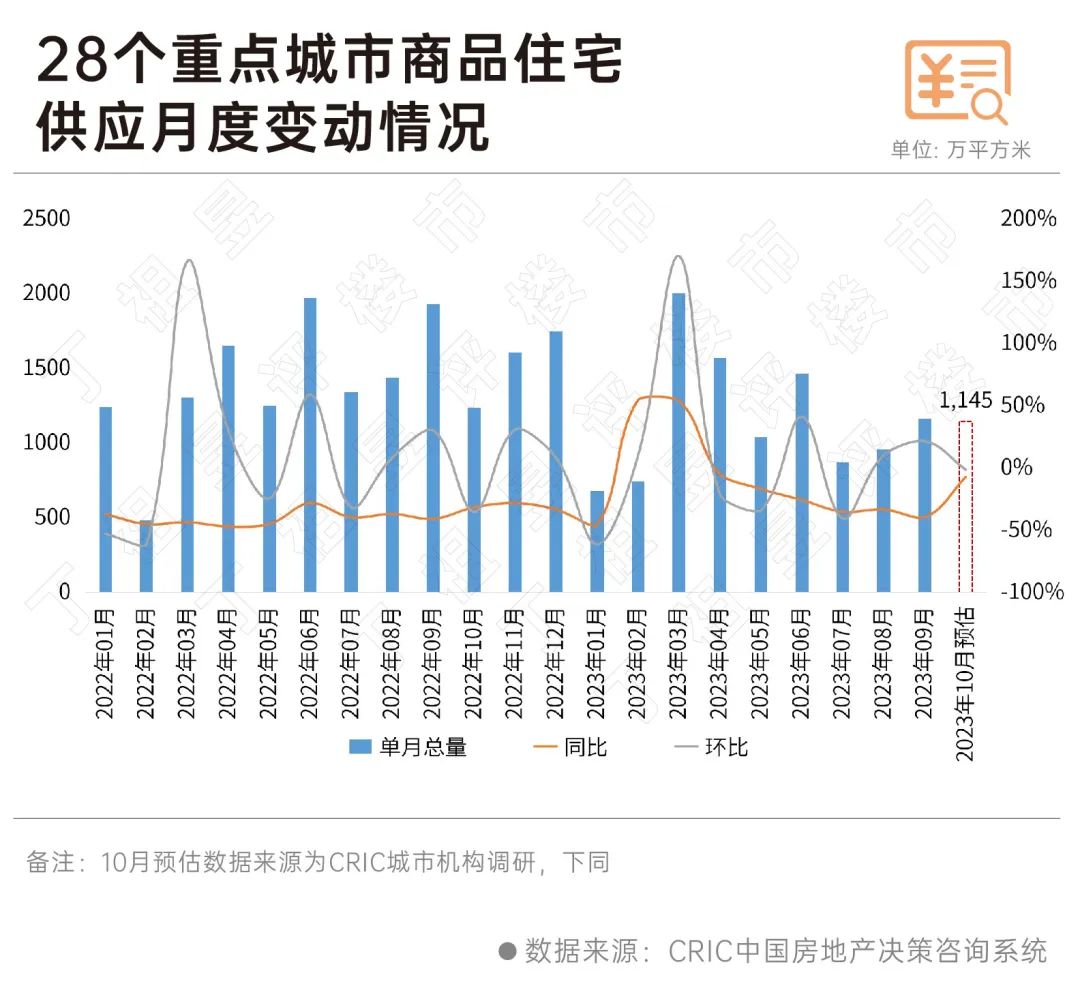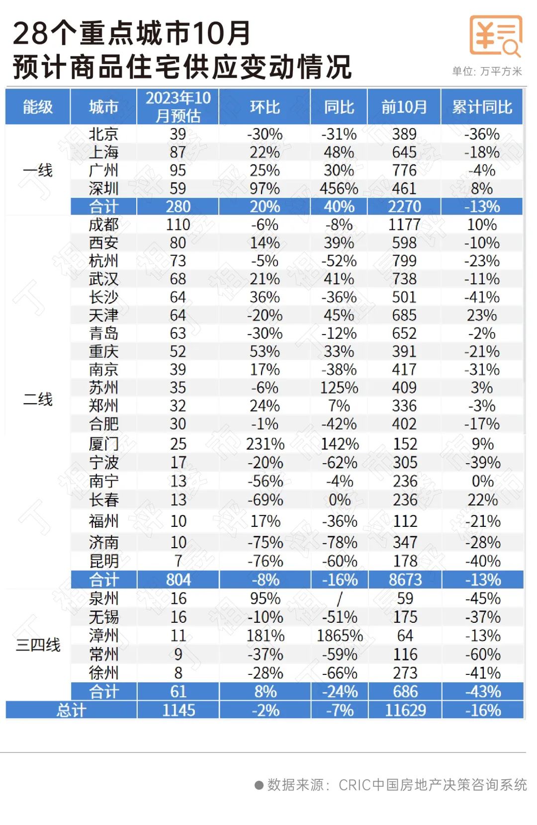 据CRIC调研,10月28个重点城市预计新增商品住宅供应面积1145万平方米,环比微降2%,同比下降7%,前10月累计供应面积将达到11629万平方米,累计同比跌幅为16%。预计四季度将迎来年内新的供应高峰。